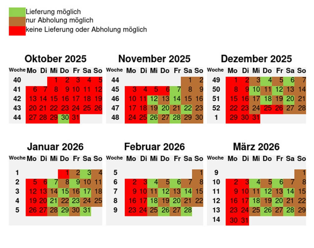 Wir liefern immer meistens an einem Mittwoch, Donnerstag, Freitag und Samstag (um die Woche Mittwoch-Freitag und Donnerstag-Samstag). Bei der Bestellung im Online-Shop können Sie den gewünschten Liefertag wählen. Ist der gewünschte Tag nicht mehr verfügbar oder ist die Lieferung nicht an einem Mittwoch, Donnerstag, Freitag oder Samstag möglich, könnten Sie uns gerne kontaktieren oder anrufen. Spätestens einige Tage vorher werden wir Ihnen die Uhrzeit mitteilen an der wir eintreffen werden. Der Liefertermin wird also rechtzeitig vereinbart und eingehalten. Wenn Sie möchten, dass wir auch eine Stunde vor Ankunft anrufen, ist das selbstverständlich auch möglich. Die verfügbaren Tage finden Sie im Kalender hier oben. Abhängig von der Postleitzahl kann es sein, dass ein 'grüner' Tag nicht mehr verfügbar ist, weil die Lieferplanung für die Strecke in der die Postleitzahl sich befindet, schon vollgeplant ist. Im Bestellprozess sind für jede Postleitzahl die verfügbaren Liefertagen angegeben. Sie können dort den gewünschten Liefertag wählen.