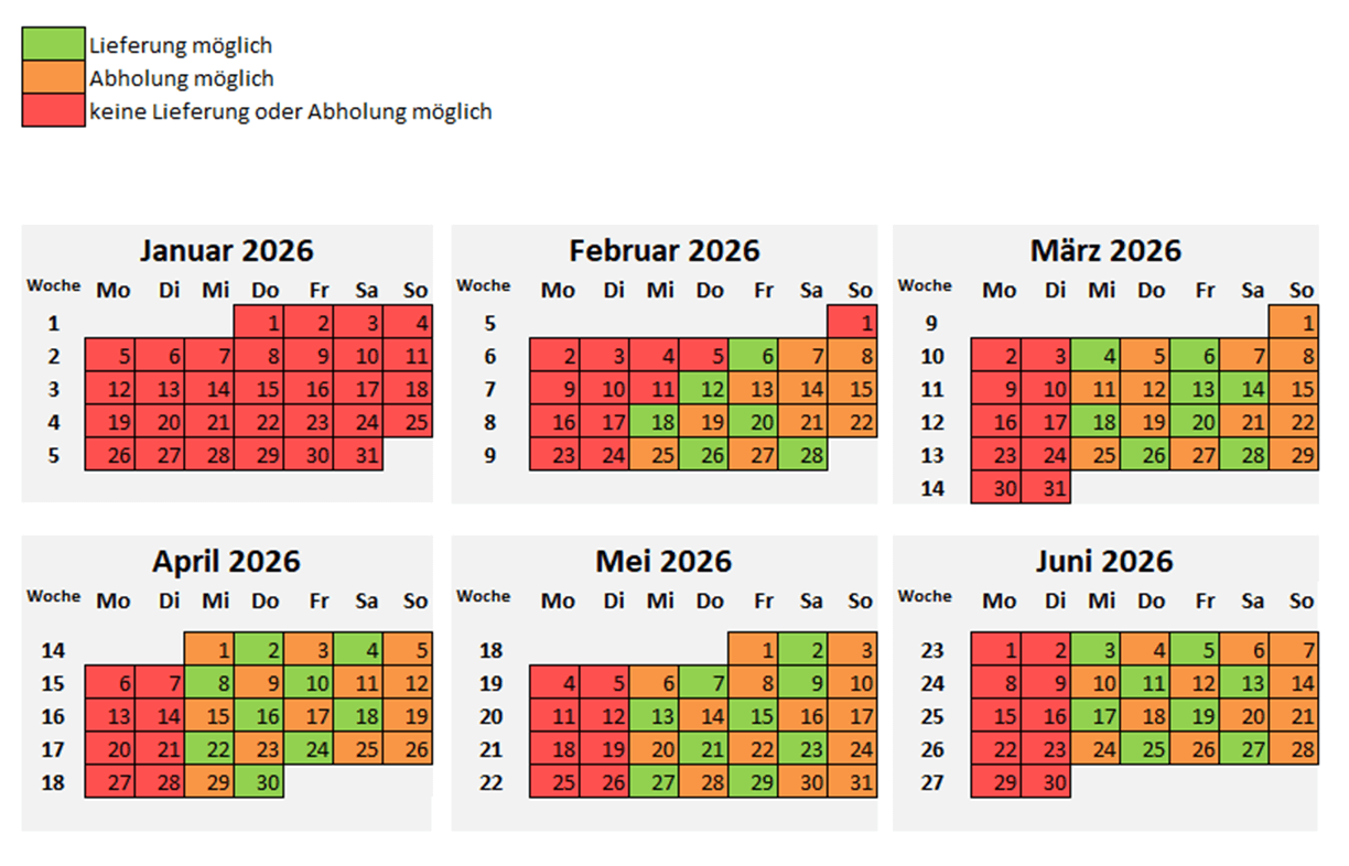 Eine Lieferung innerhalb unseres Liefergebiets innerhalb Deutschland ist versandkostenfrei ab einer Mindestbestellung von € 170,- oder € 500,- (je nach Postleitzahl). Im untenstehenden Kalender können Sie sehen, welche Tage noch verfügbar sind für Abholung und Lieferung (könnte für manche Postleitzahlen schon ausgebucht sein). Lieferungen finden meistens am Donnerstag, Freitag und Samstag statt. Abholungen am Mittwoch, Freitag, Samstag und Sonntag. Bei einer Abholung bekommen Sie 20% Rabatt. Bei der Bestellung über dem Online-Shop können Sie den gewünschten Tag wählen.