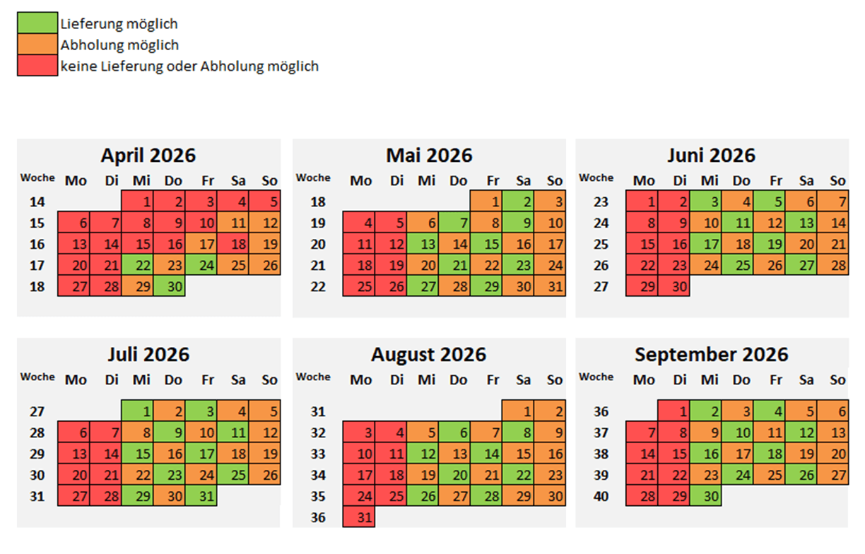 Im Kalender können Sie sehen, welche Tage noch verfügbar sind für Abholung und Lieferung (könnte für manche Postleitzahlen schon ausgebucht sein). Lieferungen finden meistens am Donnerstag, Freitag und Samstag statt. Abholungen am Mittwoch, Freitag, Samstag und Sonntag. Im Bestellprozes können Sie ganz bequem den gewünschten Tag wählen.